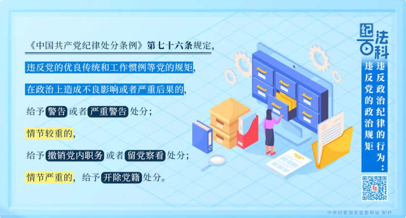 《中国共产党纪律处分条例》第七十六条规定,违反党的优良传统和工作惯例等党的规矩,在政治上造成不良影响或者严重后果的,给予警告或者严重警告处分;情节较重的,给予撤销党内职务或者留党察看处分;情节严重的,给予开除党籍处分。