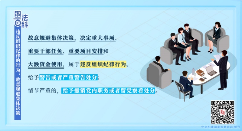 《中国共产党纪律处分条例》第七十七条规定了违反民主集中制原则的四种情形,其中之一就是故意规避集体决策,决定重大事项、重要干部任免、重要项目安排和大额资金使用。《条例》规定,对该违纪行为,给予警告或者严重警告处分;情节严重的,给予撤销党内职务或者留党察看处分。